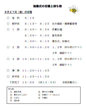 夏休みも残りあとわずか!課題や持ち物など、2学期に向けた準備はできていますか。皆さんに会えるのを楽しみに待っていますね。