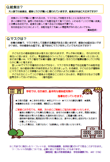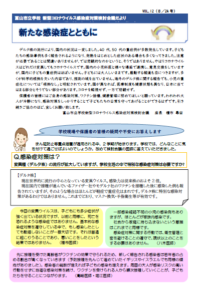 新型コロナウイルス感染症対策検討会議だより12号が届きました。配付文書のコーナーにアップいたしましたので、ぜひご覧ください。ご家庭には、27日(金)にお子様を通じて配付いたします。