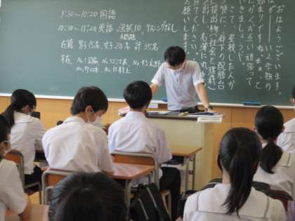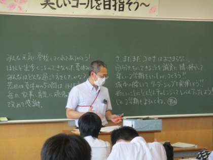今日から二学期が始まりました。教室には、担任の先生の励ましの言葉が黒板いっぱいに書かれていました。それを落ち着いた様子で読んでいる生徒たちの様子に担当者一同喜んでいます。