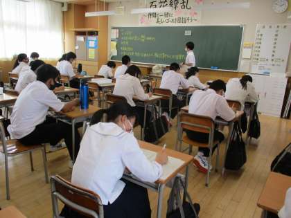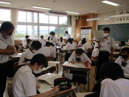 中:2年2組 「盆土産」の登場人物の人柄や心情について、班ごとに学習しています。