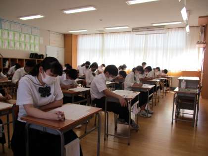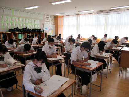 さすが、3年生!初日の1時間目から大変集中して取り組んでいます。写真は試験終了5分前の様子ですが、最後の1分1秒まで回答の確認に余念がありません。(社会の試験を受検中です。)