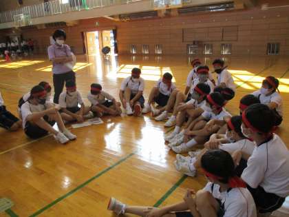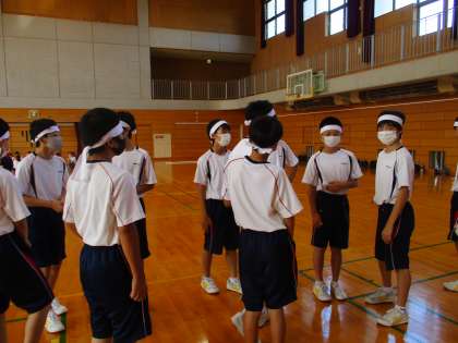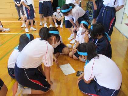 体育大会の学年練習が始まりました。団で協力して「城中ハリケーン」の作戦を考えています。