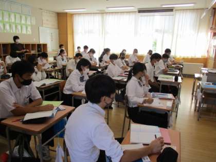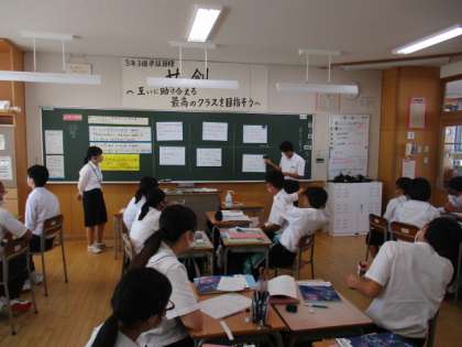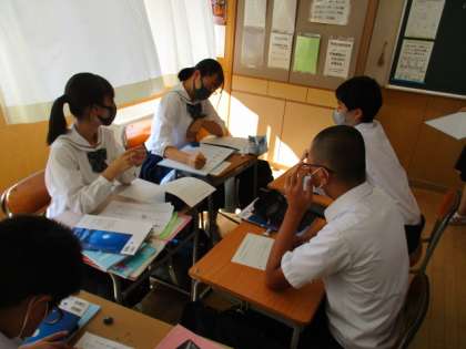 「後ろから詳しく説明する表現」を使って、文に表したものが何かを当てるクイズを作成しています。お題の物の特徴をグループで出し合い、それを協力して英文にしています。楽しい雰囲気の中で英文づくりに頭をひねる生徒の姿が、とても輝いていました。