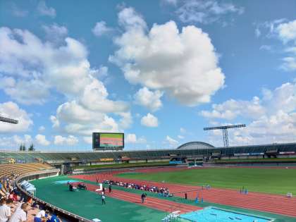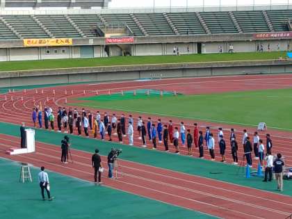 秋晴れの青空のもと、開会式が始まりました。気持ちが高まってきました。城山中学校主将が右端に見えます。