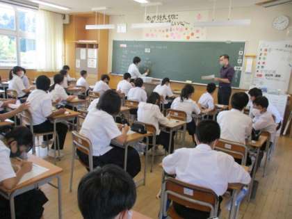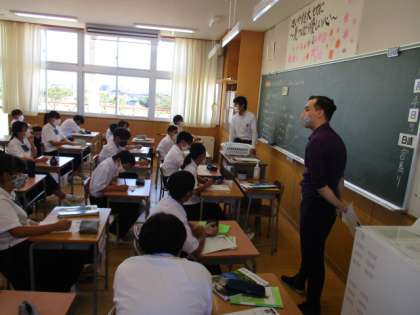 「ペアで会話を成立させよう」ということで、ペアの相手に聞く内容や、それに対する反応の仕方などを全体で確かめています。その上で、ペアでの会話に挑戦しました。
