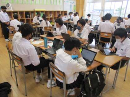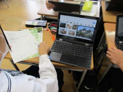 クロムブックを活用し、見学地について調べ、コースを考えています。