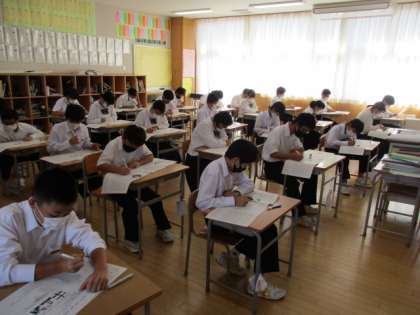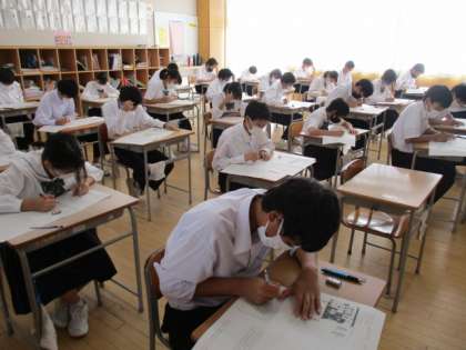 1年生の1日目最初の教科は、英語です。リスニングの放送を注意深く聞き、真剣に考えて答えています。