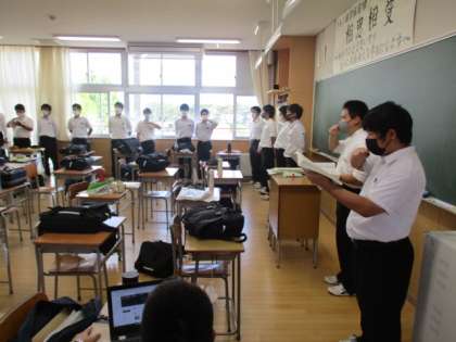 3年生が面白い練習をしています。あごの下に手を置いて歌っています。その手よりも上に向かって響かせようという練習のようです。いろいろと工夫して、よりよい合唱にしようとがんばっています。