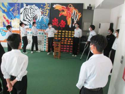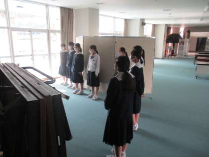 2年2組は男声と女声にわかれて、音を徹底的に確かめています。多目的ホールに男声の力強い声が響いています。
