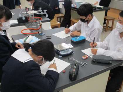 実験の結果や考えたことを、ノートに丁寧に記録しています。