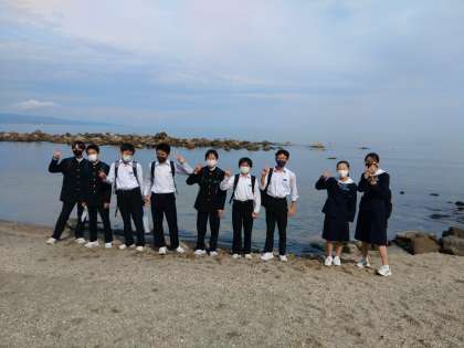 道の駅雨晴へ徒歩で来た班が到着しました。伏木から40分ほどかかりましたが、海をみながらゆっくりと景色を味わって来たそうです。