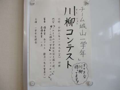 1学年では、学年生徒会主催の「川柳コンテスト」を実施しました。「チーム城山1学年」としての学校生活も残り4か月あまり。今の思いを川柳に込めました。