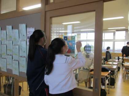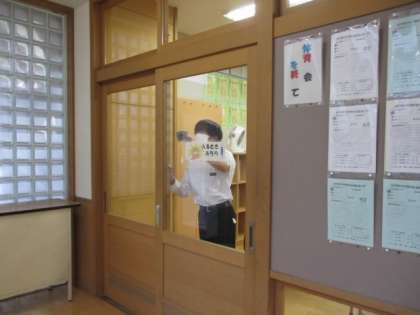 本日より4日間にわたって、ボランティア委員会による「清掃強化週間」が始まりました。学校訪問研修会という学校行事をきっかけに、清掃時間に清掃の重点項目を設定し、より一層過ごしやすい学習環境を整えるための活動です。本日の重点項目は「くもの巣とり」と「窓磨き」です。ボランティア委員会から呼びかけを行い、各学級で協力して普段よりも念入りに清掃に取り組みました。