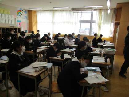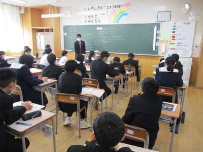 whoseを使って「この落とし物はだれのもの」と聞く文をどうつくるかについて、みんなで考えています。