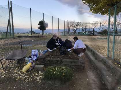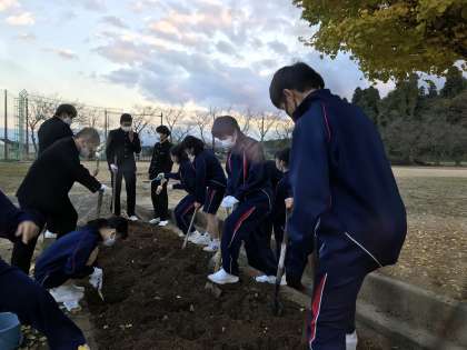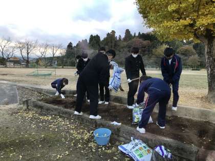 本日、放課後に実践委員会がありました。ボランティア委員会では、地域の園芸センターから頂いたチューリップの球根を植えるために、花壇の土づくりを行いました。雑草を抜いて、落ち葉を拾い、培養土を足しました。来週はいよいよ、球根植えを行います。日頃から家で農作業の手伝いをしている生徒もおり、手慣れた手つきで鍬やシャベルを使って作業を進めていました。