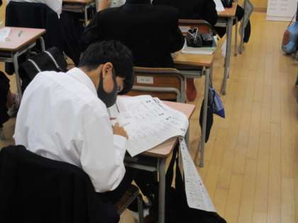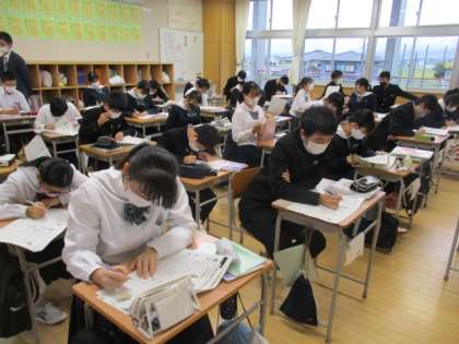 期末テストに向けて、これまでの復習をしています。生徒同士教え合いながら、分からないところをなくそうとしています。