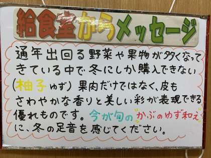 今日の給食は「ゆず」「梅」と大人の味でした。