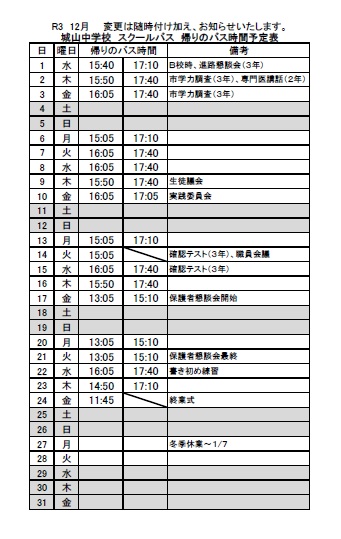 12月のスクールバス運行予定表です。ご確認ください。 12月運行予定表 ←ここをクリック