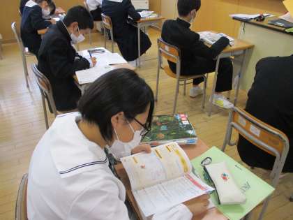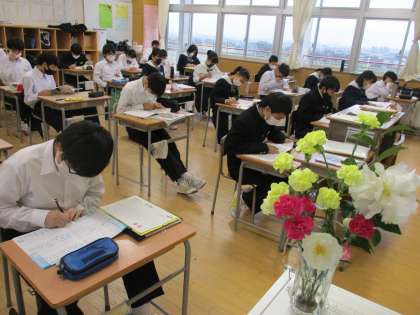 1学年では、ほぼ全員が8時10分に着席することができています。ある教室では、生徒が家から持ってきてくれた花が飾られる中、テスト勉強に励んでいました。