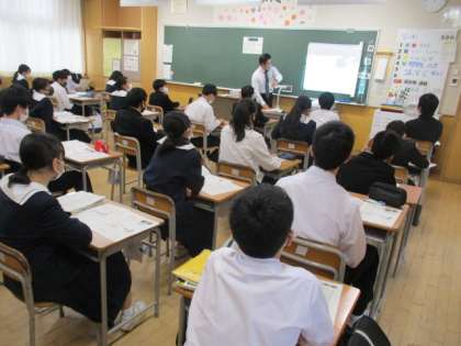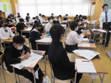 期末考査の解説が行われています。グラフや表を見ながら、考え方や答え方について確認しています。