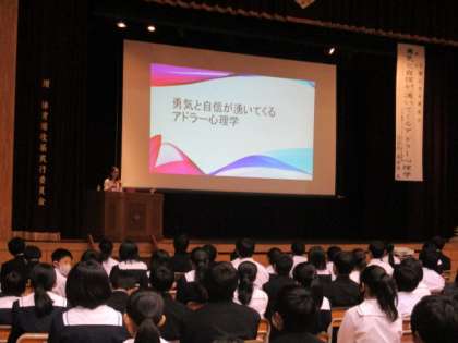 5、6時間目は、ひびのあゆみ先生をお迎えして、先輩に学ぶ講演会を行いました。「勇気と自信がわいてくるアドラー心理学」の演題でお話しいただきました。「勇気とは」「信頼とは」などの問いかけがあり、ペアで話をする場面もたくさんありました。お話を聞く、ペアで話をする、発表する友達の話を聞く、などの活動を通して、自分を見つめ直したり、自分なりの目標をもったりすることができたようです。