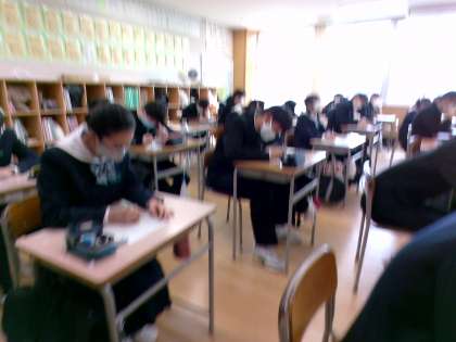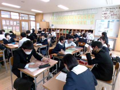 学年生徒会からの提案を受けて、クラスに戻り、自分たちの学習方法についてまとめました。学習に取り組む時間帯や学習環境を整える工夫などを具体的にまとめました。最後に班になって、意見をシェアしました。他の人の意見で参考にしたいと思ったアイディアを書き留めるなど、これからの勉強に生かしてみようと、これからの学習に意欲的になれた生徒もいたようです。