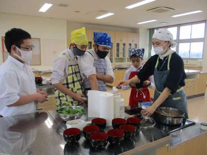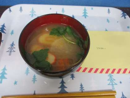 さくら級では、家庭科の時間にお雑煮を作りました。分担を決めて材料を切ったり、みんなで味見をして仕上げたりしました。大変美味しくでき、心も体も温まりました。また、日頃お世話になっている先生方にお手紙付きで食べていただきました。