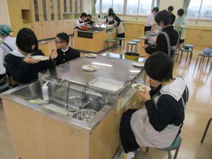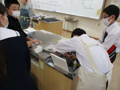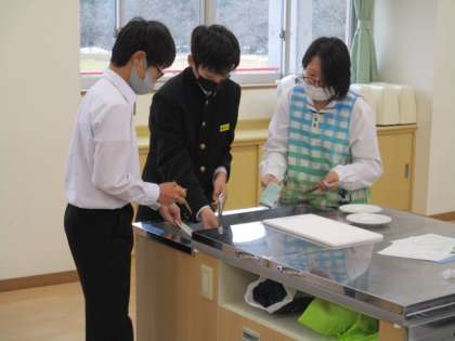 1年生では調理実習が行われています。鮭のムニエルとキュウリもみをつくっています。みんななかなかの手際で、上手に焼き上がっていました。片付けも協力して行っています。家でも挑戦してみてほしいものです。