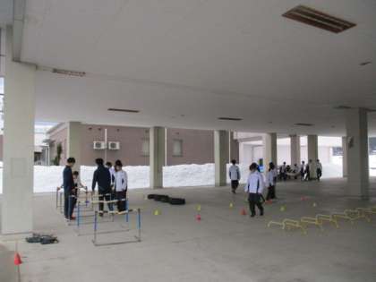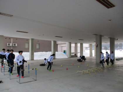陸上部は練習開始前から体をじっくりと温めています。各自ストレッチをしたり軽く体を動かしたりと、けがをしないようゆっくりと体を起こしています。