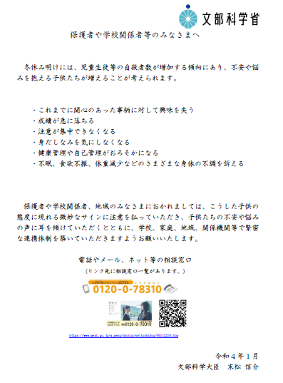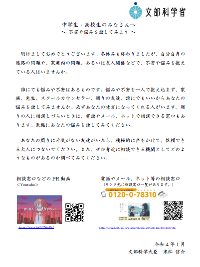 1月11日(火)「中学生・高校生のみなさんへ 〜 不安や悩みを話してみよう 〜」 末松 文部科学大臣からのメッセージ