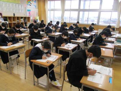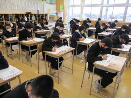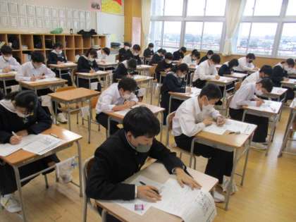1年生は冬休み明けテストに取り組んでいます。今日は英語で、明日は残りの国語、社会、数学、理科に取り組みます。1、2学期の学習を振り返りながら、一生懸命考えています。