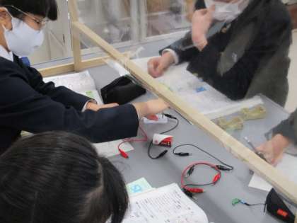 電流が通る回路をつくっています。考えた回路を実際につなげてみて、電球がつくかどうかを確かめています。
