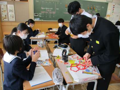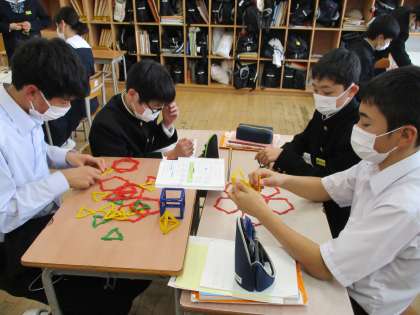 1年生では、ポリドロンという教具を使い立体をつくり、正多面体の特徴を調べました。