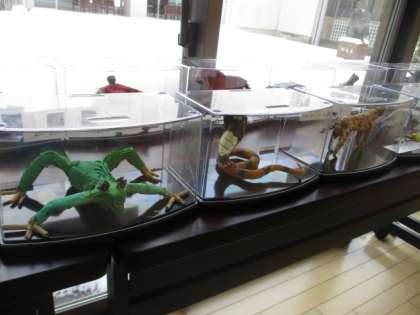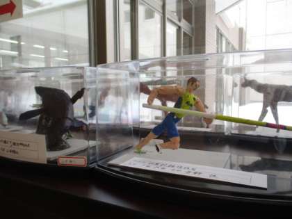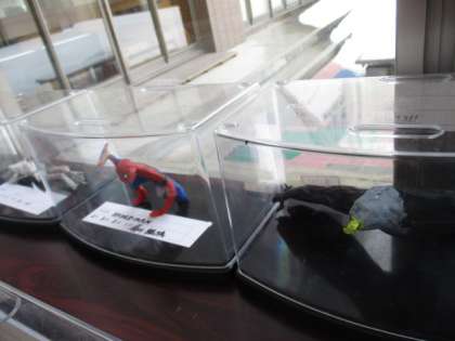 職員室前の廊下には、2年生の美術作品が展示されています。どの作品も個性的で素敵に仕上がっています。たくさんの動物の中にスパイダーマンや棒高跳び選手もいました。
