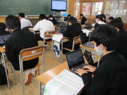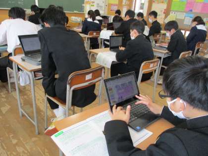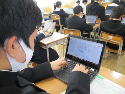1学年では、総合的な学習の時間に職業について調べています。冬休み中に身近な人にインタビューをしたこと等をクロームブックでスライドにまとめました。