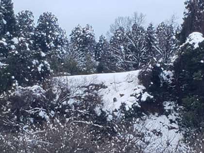 学校の裏山の斜面でカモシカの親子が立ち往生していました。上にも下にも進めず、親と思われるカモシカは、子のところへ近付き励ましているようでしたが、なかなか進展せず・・・。教育委員会に問い合わせると、鹿は人の視線を感じたり明るい場所では動かなくなるので、暗くなったら動くのではと。しばらく見守っていましたが、夕方姿が見えなくなりました。無事に山へ帰っていますように・・・。