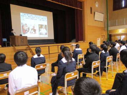 1年生では、学校医の水野先生による喫煙防止教室を実施しました。喫煙が原因となる病気や副流煙の害等について写真やデータを用いて詳しく学ぶことができました。