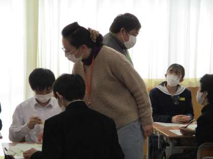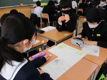 1学年では、保健体育科の時間に、心の働きの発達について学習しました。グループで意見を出し合い、丁寧にワークシートにまとめていました。