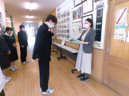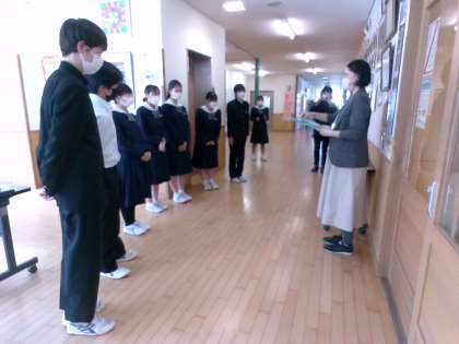 産休に入られる家庭科の平山先生へ、2学年生徒会から感謝を込めてメッセージをお渡ししました。