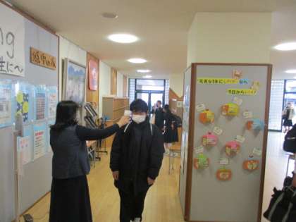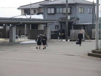 3連休明けの朝、城中生は元気に登校しています。寒さが少し緩んでいるせいか、コートなしで登校する生徒の姿もちらほら見られるようになりました。こんなところでも、春の足音が聞こえてくるようです。