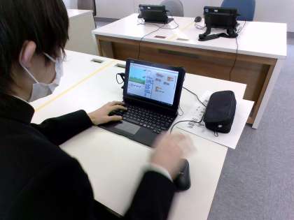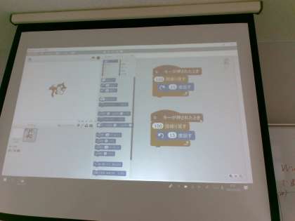 プログラミングに取り組んでいます。今日は、「動き」、「見た目」、「イベント」、「制御」、「調べる」のスクリプトを活用して、楽しい動きを考え作っています。集中して取り組んでいます。