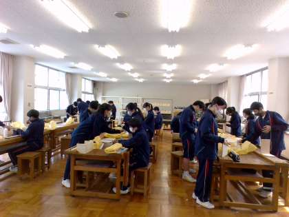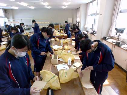 ブックケースの製作では、多くの生徒が組立作業に入っています。心を落ち着かせて丁寧な作業を心がければ、良い作品に仕上がります。