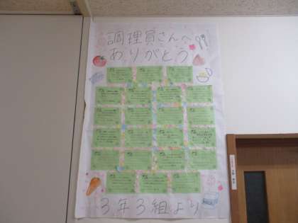 給食室前には、3年生から調理員さんへの感謝のメッセージが掲示されています。「毎日美味しい給食ありがとうございます」「栄養のバランスのとれた給食のおかげで、ここまで大きくなれました」等、感謝の気持ちをメッセージに込めていました。