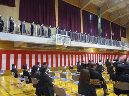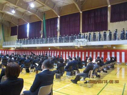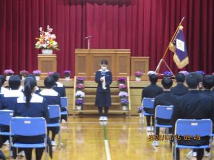 在校生代表が、先輩方への感謝の気持ちと、伝統を引き継ぐ強い決意を伝えました。在校生はギャラリーからの参加でしたが、全員起立して、きりっとした態度で3年生へ思いを伝えました。