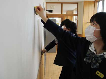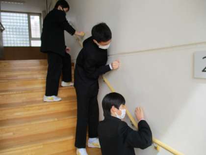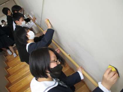 1学年では、1年間、毎日通った階段や廊下の壁を磨きました。うっすらと黒ずんでいた壁が白くなり、心も美しくなったように感じました。