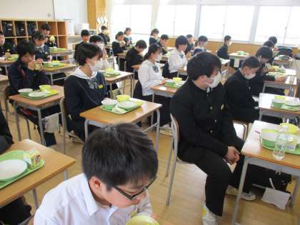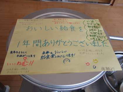 今年度最後の給食となりました。おいしく温かい給食が食べられることに感謝して、残食なくいただきました。