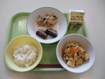 今日の献立は、いわしの梅煮、はりはりソテー、厚揚げの錦とじ、そしてごはんと牛乳です。おいしくいただきましょう。