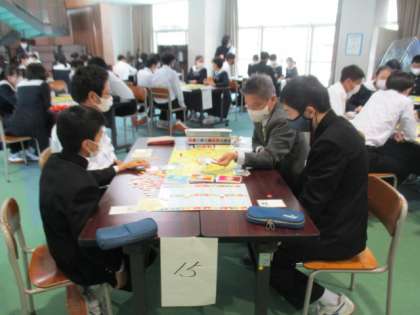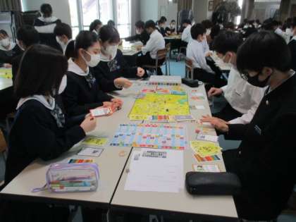 SDGsボードゲーム公認ファシリテーターの講師の方が来られて、修学旅行で訪れる予定の京都市の抱える問題をSDGs目線で学びました。ミッションカードに書かれている内容を班員同士で議論しながら解決策を考え、真剣に取り組みました。