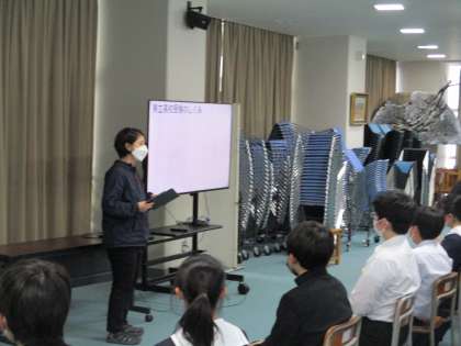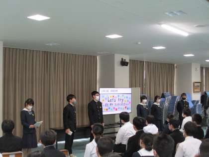 学年生徒会から、学年目標、学級目標の紹介がありました。先生からは、学習面、生活面についての注意事項が話されました。