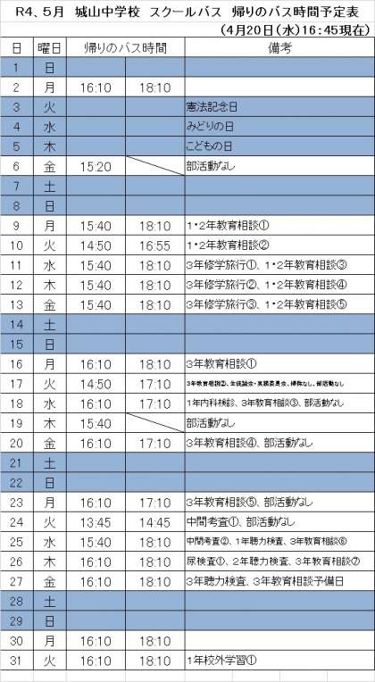 5月のスクールバス運行予定表です。ご確認ください。
